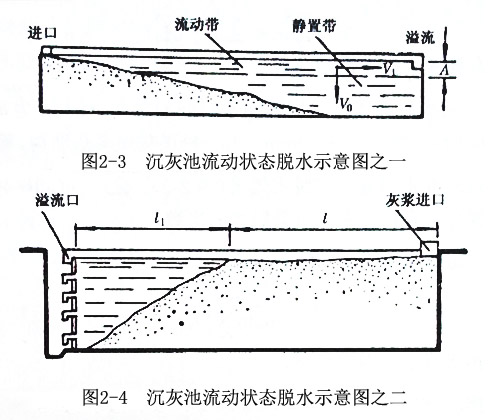 灰水流動狀態(tài)的脫水是灰水由沉灰池的一端進(jìn)入,澄清水由另一端溢流排出的連續(xù)作業(yè),灰粒在灰水流中邊流動邊沉降。在沉灰池中灰水分為兩帶,上層灰水流動部分稱為流動帶,下層靜止沉降積灰部分稱為靜置帶(圖2-3和圖2-4)。沉灰池中粗、重顆粒,由于水力沉速快,穿過運(yùn)動帶的時間很短,被灰水流攜帶向溢流口移動的距離也很短,故在沉灰池進(jìn)口處快速沉降,而形成一個坡向溢流口的斜面?;宜粩嘁M(jìn),澄清水溢流,斜面積灰層逐漸增高,待溢流水中含灰量超過允許限度(<0.1)時就關(guān)閉灰水進(jìn)口閘門,再靜置一段時間后,入出澄清水就可以挖灰使用。