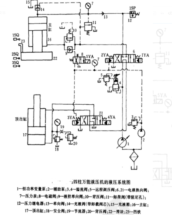 5、最后主缸停止時的狀態(tài) ,當主缸滑塊上的鐵23按下沖程開關(guān)1SQ時,電磁鐵2YA被切斷,主缸活塞被位于M功能中心的閥門6鎖定,停止運動,返回行程結(jié)束。此時,泵1油通過閥門6,閥門21返回油箱,泵處于卸載狀態(tài)。在實際使用中,主汽缸可以在任何時候停下來。